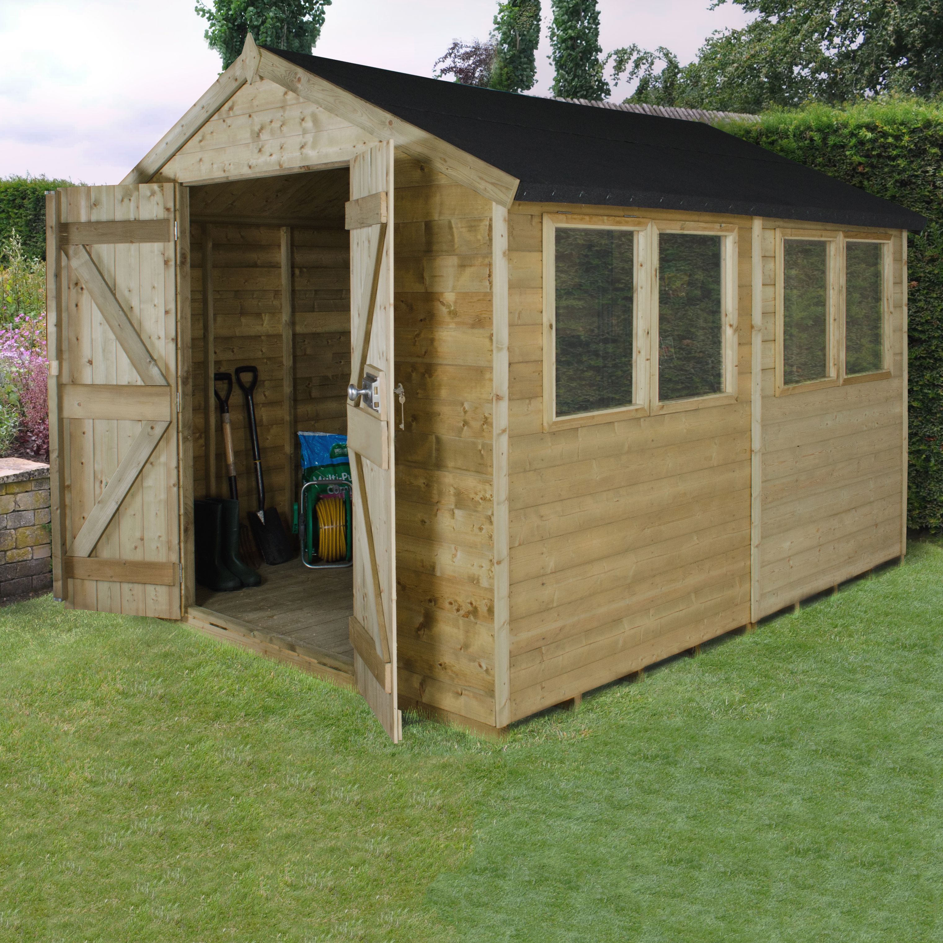 10x8 Pressure Treated Wooden Shed Base included - BQ for all your home and garden supplies and advice on all the latest DIY trends. We have an excellent selection of cheap sheds available in a wide range of different styles and sizes. 10x8 sheds are perfect for medium-sized gardens budgets and needs.